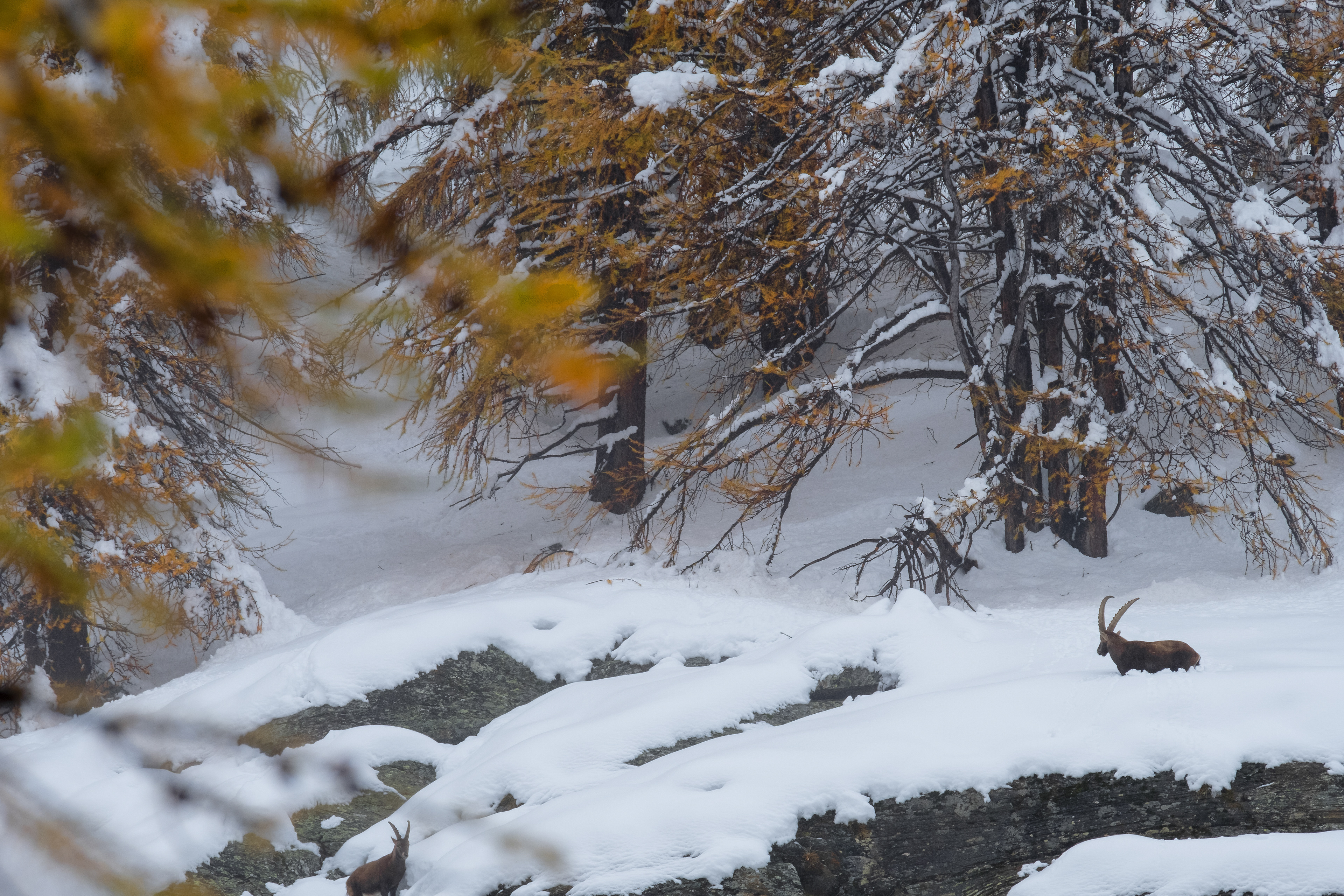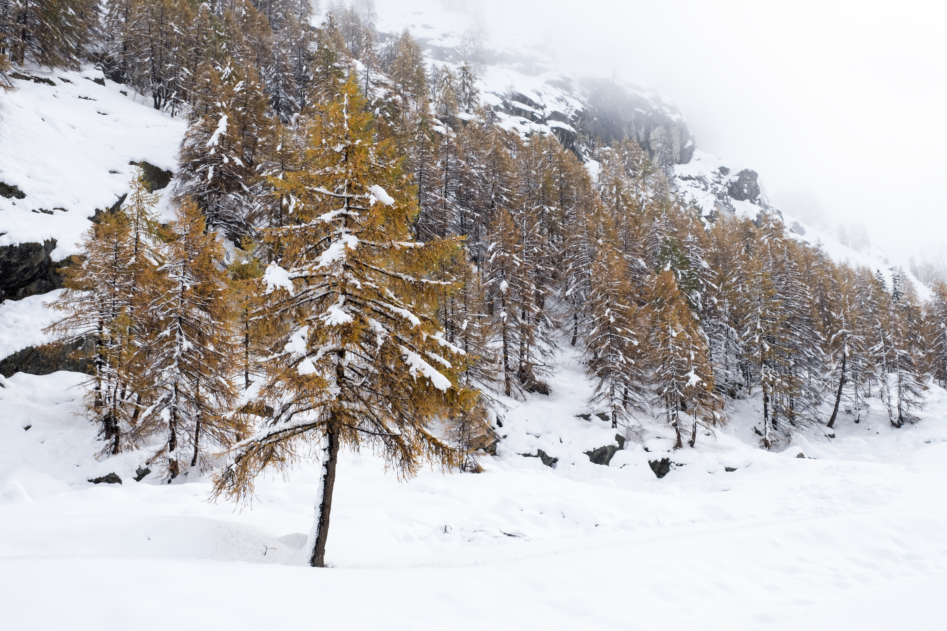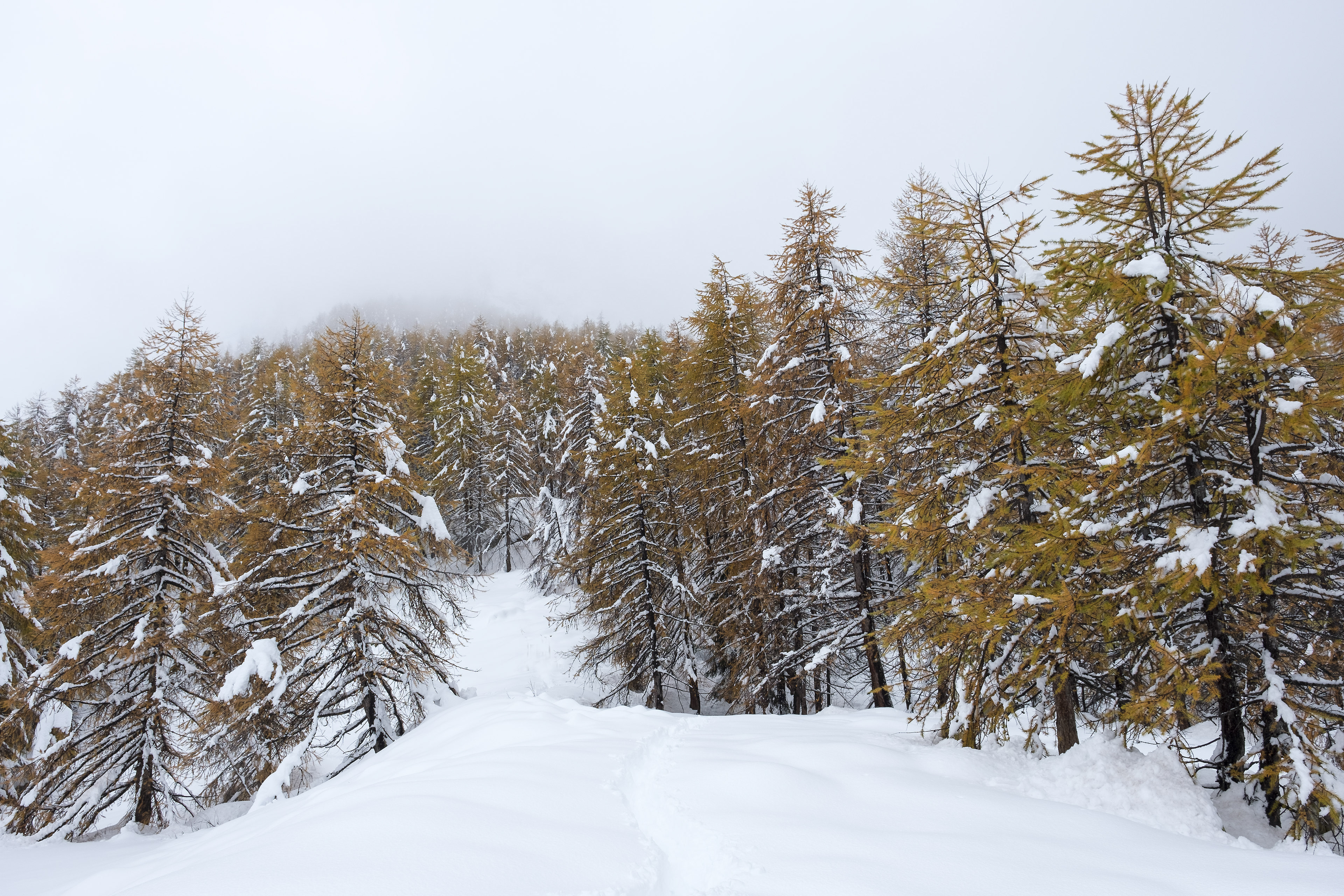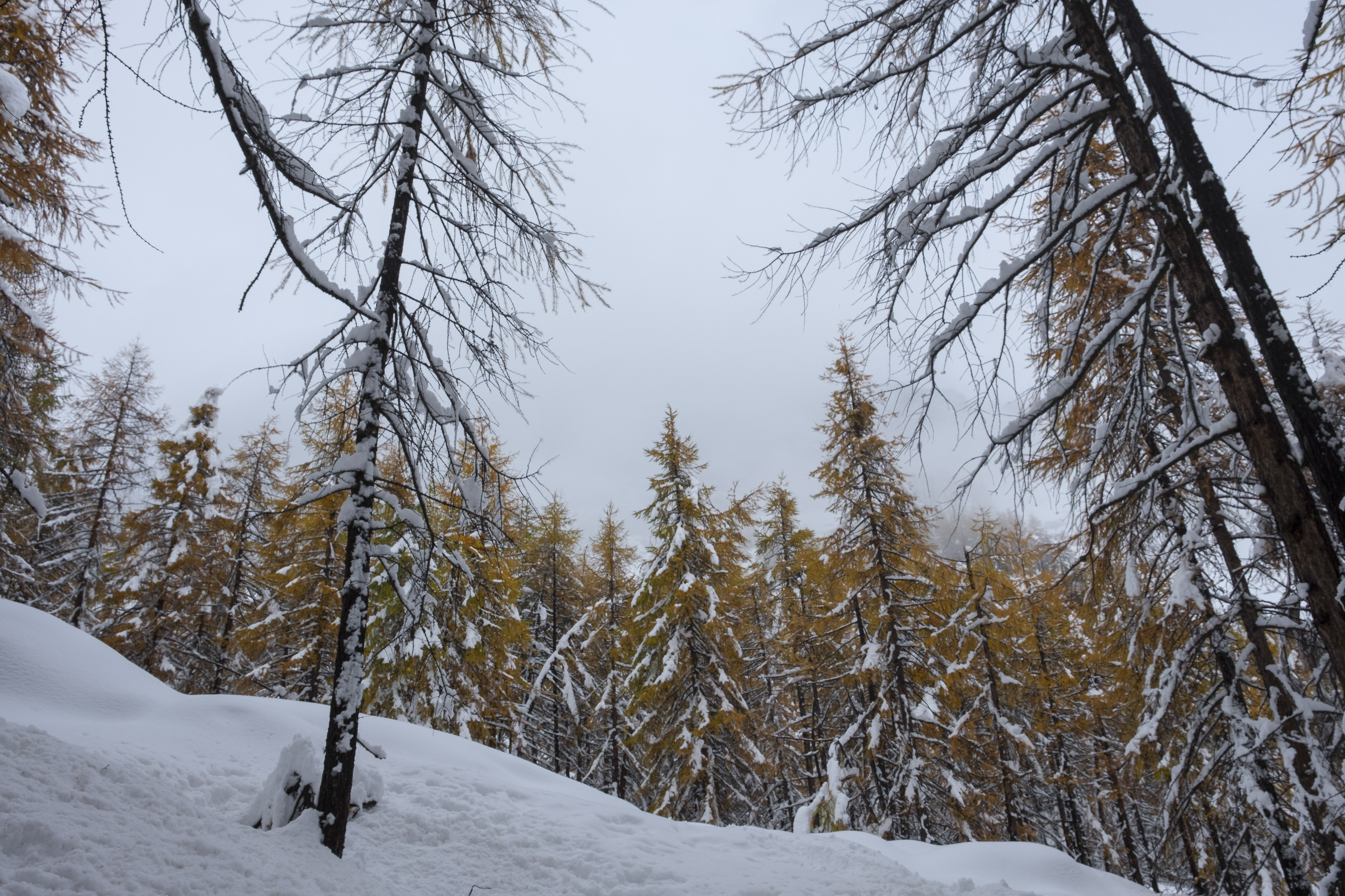 Walking in the forest , in Valsavarenche with the first snowfall